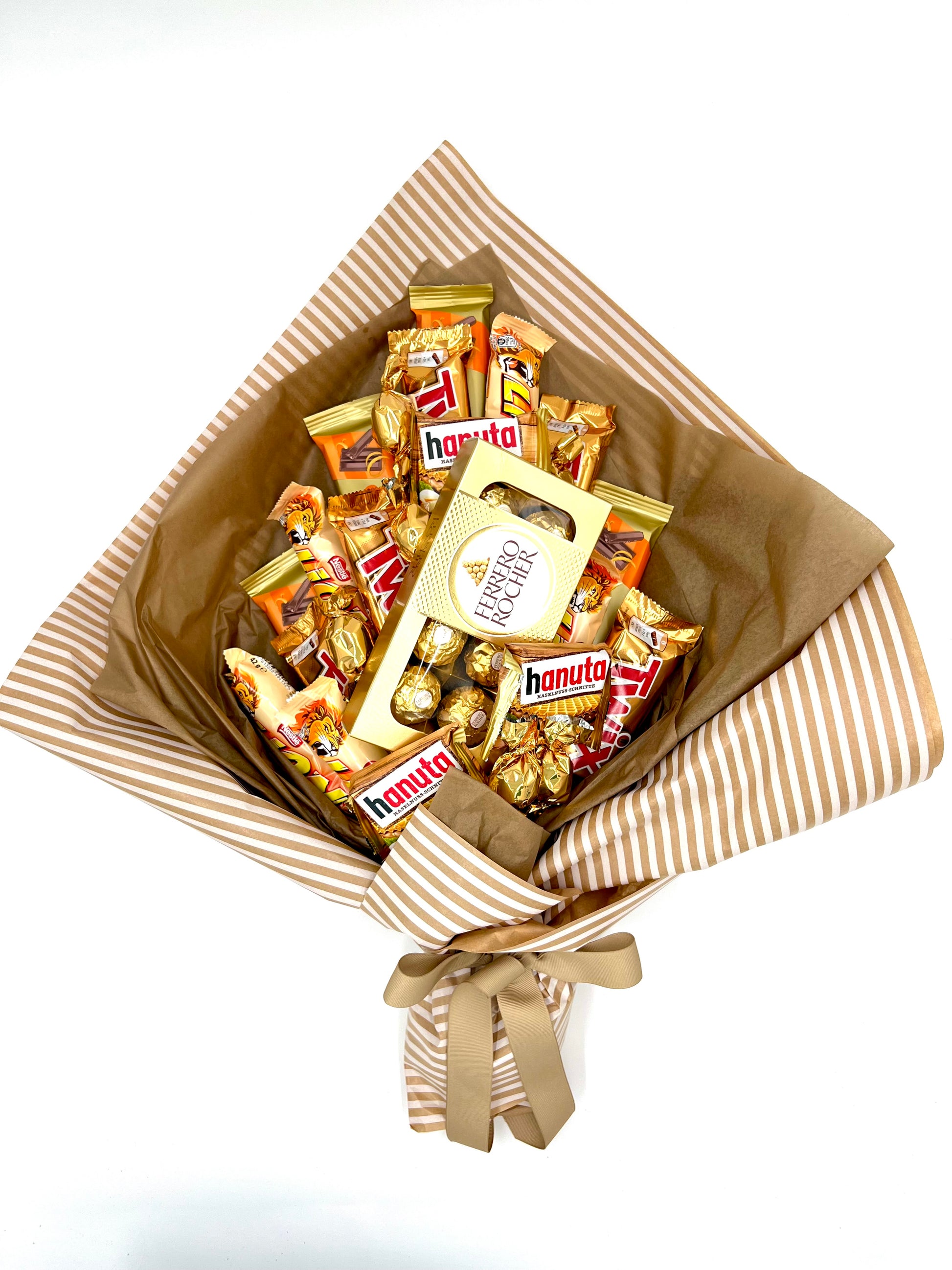 Drop blomsterne – her får du en buket, der kan spises Luksus Buketten er fyldt med lækre Ferrero og en masse guld og er pakket ind i stilfuldt brunt silkepapir.